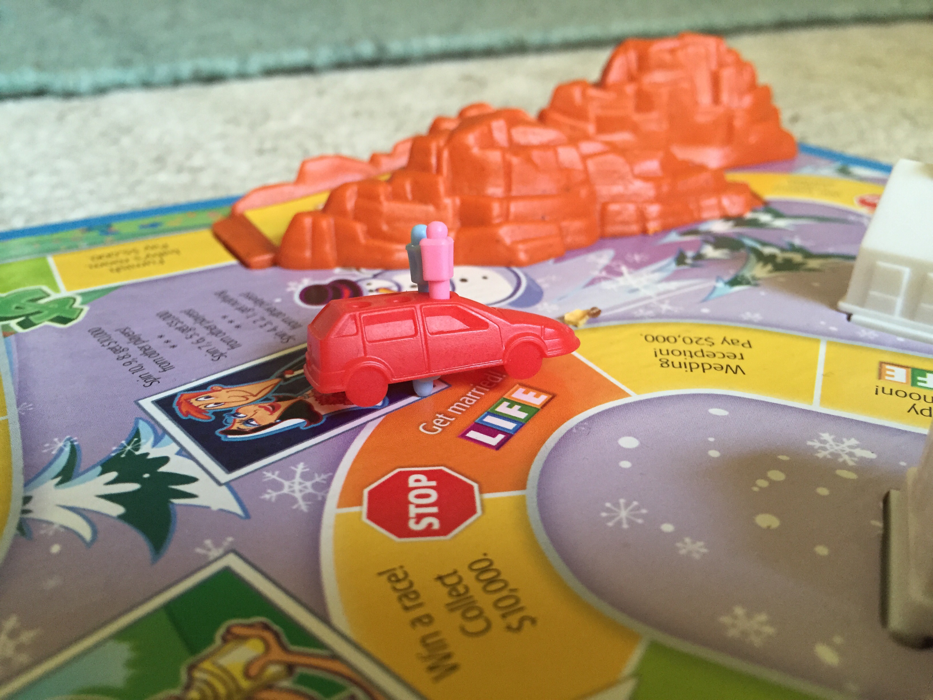 My 12-yr-old’s gamepiece wasnt lying flat on the board. I asked him why it was tippy. He showed me that he’d stuck a people peg under the car and said, “Its Jimmy (pronounced Jim-may) who I’m smuggling into the retirement home. All he has to do is ride through life with me.”