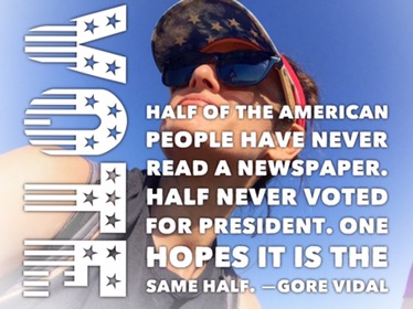 Half of the American people have never read a newspaper. Half never voted for President. One hopes it is the same half. —Gore Vidal Share this: Click to share on X (Opens in new window) X Click to share on Facebook (Opens in new window) Facebook Click to email a link to a friend (Opens in new window) Email Click to share on Pinterest (Opens in new window) Pinterest Like Loading... Related