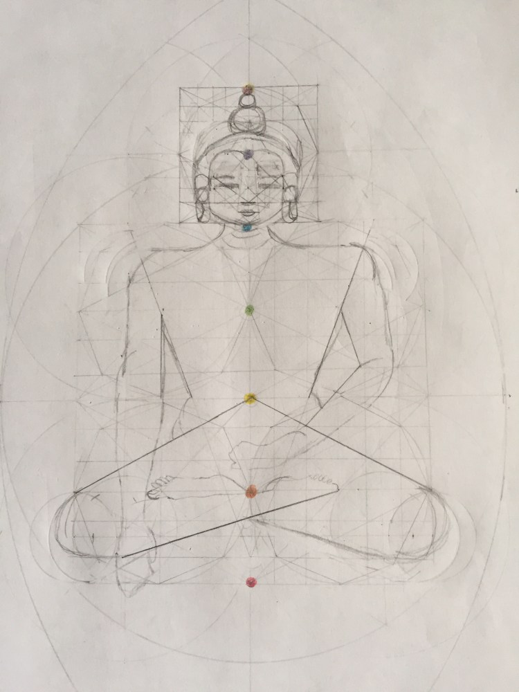 This is my first attempt to bring forth a human figure from a geometric shape, a square. It is the Tibetan Buddha. I wasn’t rigorously precise with my lines which made this work a little sloppy, but I think it is very exciting that I was able to construct a human body using no more than lines and proportions that I drew using a compass and a straight edge. I didn’t take any measurements. I only used proportional lines and shapes that could be constructed within the original square that I created from the intersection of two enormous circles that shared a radius.